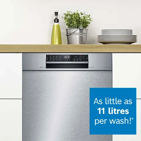 Save water with a Bosch Dishwasher!Save up to 180L of water a week with a dishwasher compared to handwashing.* *Based on 132 items, 4 times a week; dishwasher on Eco cycle.View the range